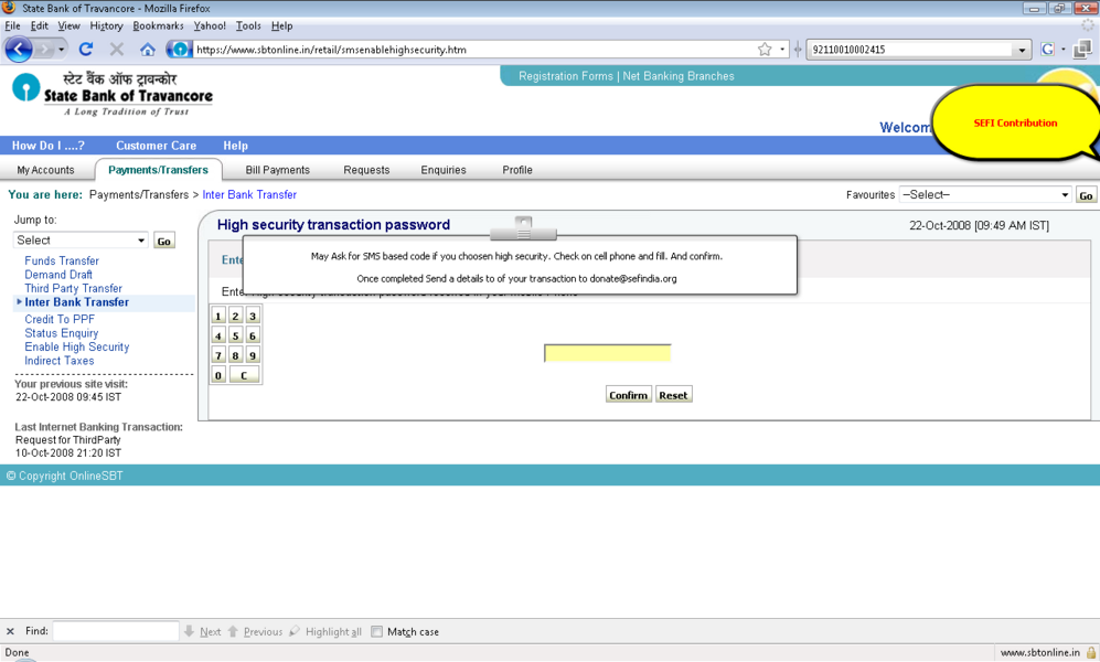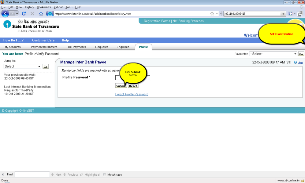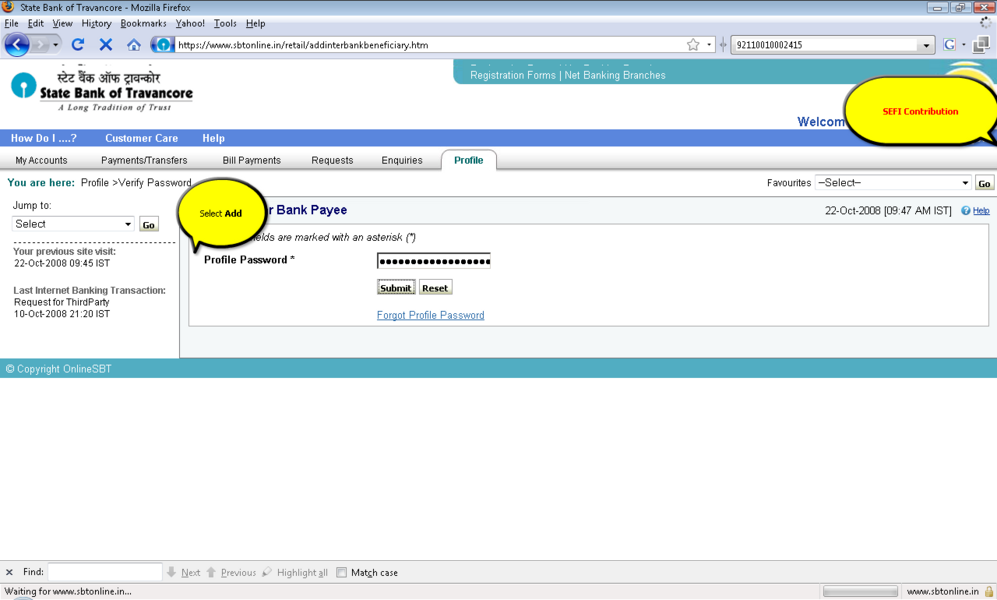 过程: 1。你应该积极的网上银行用户事务的权利。 2。登录到www.onlinesbi.com或web站点的印度国家银行以外的银行如果它使用您的印度国家银行网上银行ID和密码或任何国家银行集团银行在这个例子SBT使用。