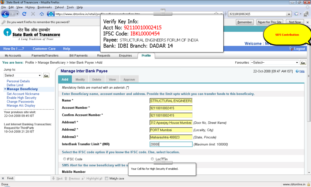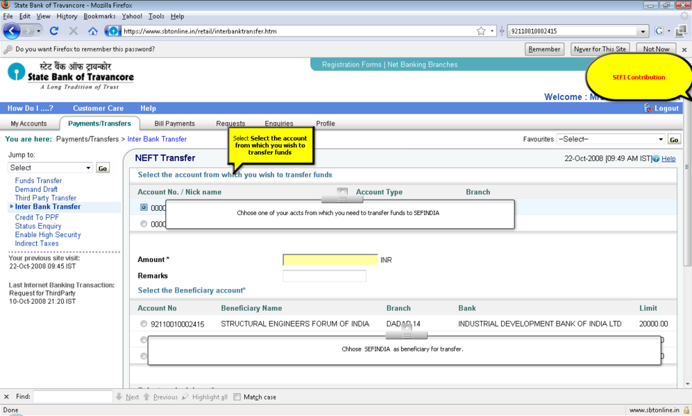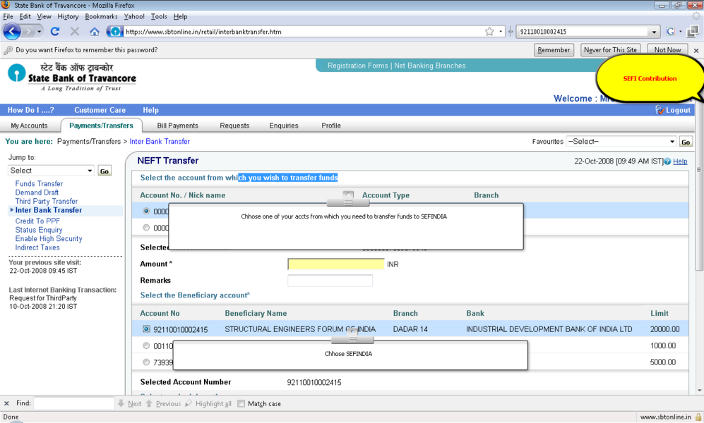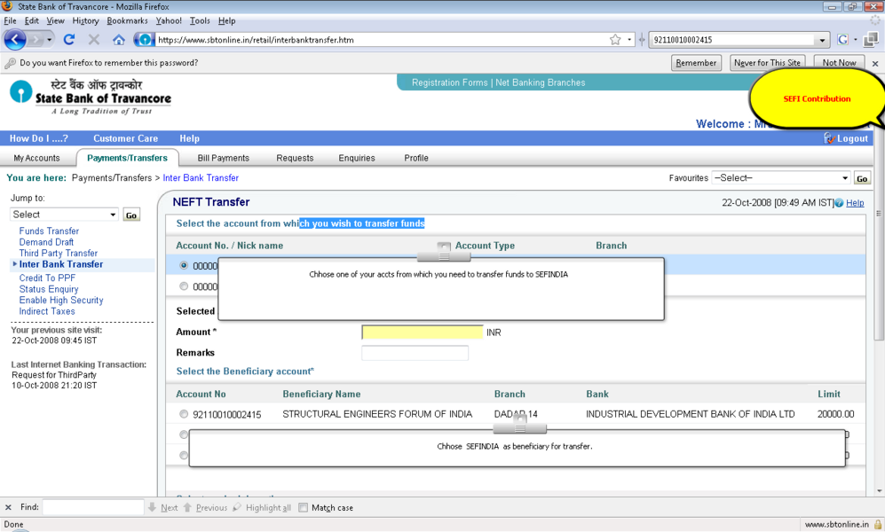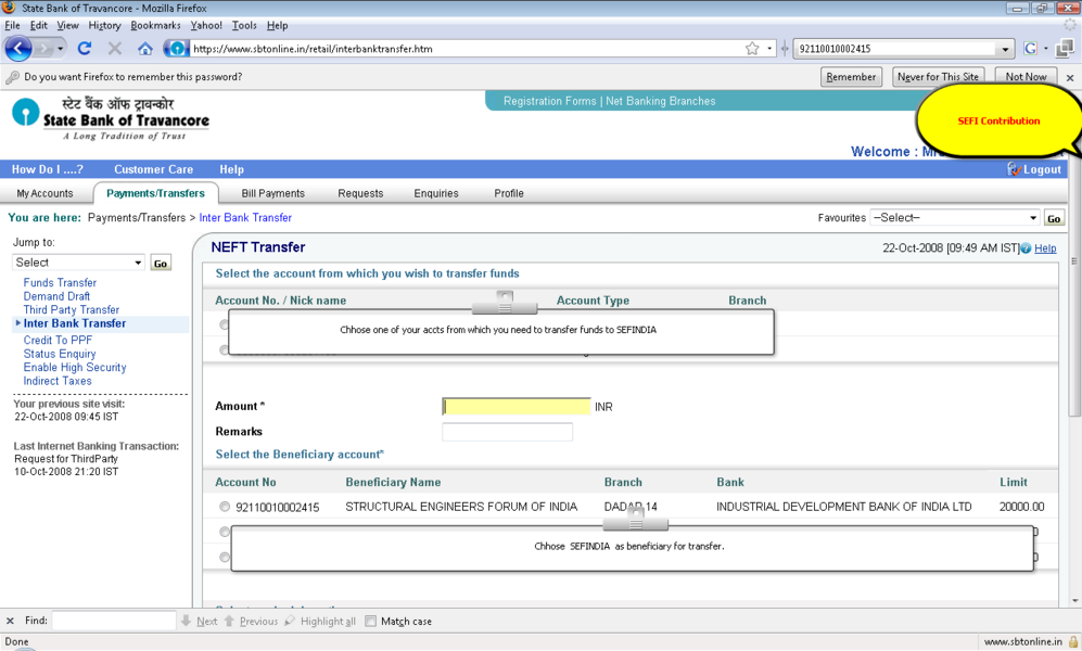 188金宝搏ios官方app下载SEFINDIA在线贡献示范(NEFT例子,国家银行集团)(使用HDFC银行账户而不是IDBI账户) (所有银行的信息是有效的步骤可能略有不同)。 关键信息: 188金宝搏ios官方app下载SEFI账户信息为新的世界经济论坛2010年4月1日 赞助可以发送通过划线支票/ DD 4 Jorawar餐馆93妇女Karve Rd 孟买400 020
