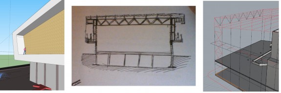 问题是这样的;我想有一个我走道在中期水平。e悬臂approximetely中间的每一列(意识到)。反过来,我也要求屋顶悬臂以庇护这走道,沿整个长度的结构。