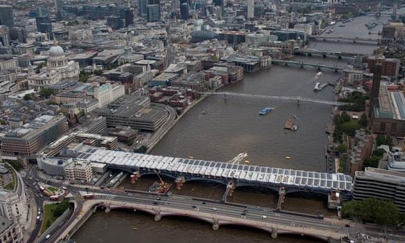 作为Thameslink计划的一部分,在Blackfriars车站平台延长横跨泰晤士河和部分支持的1864个桥墩。这个项目是由威尔设计和建造的巴尔弗·贝蒂。工作还包括安装的屋顶覆盖着photovoltiac太阳能电池板(超过4400个太阳能电池板安装在新的Blackfriars站平台),为伦敦提供一半的能量Blackfriars站。维多利亚时代在Jan.2014完成,这桥有6000平方米的太阳能光伏(PV)板,这使得伦敦最大的太阳能电池阵列。Solarcentury(太阳世纪控股有限公司,公司管理安装,英国预计电池板产生每年900000千瓦时的电力,车站提供一半的能源和减少年度二氧化碳排放量约511吨。