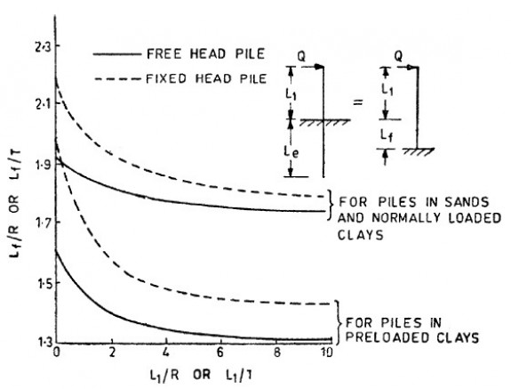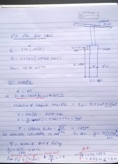 Er。Saikiran, 没有听到你回应我的查询细节和加载结构。请解释你为什么特别提供桩浅基础的只有1.50米的深度。您可以考虑孤立的立足点,最好是联系在一起的存根,像一个地基梁,提供稳定的水平加载。顺便说一下,会有很多风荷载引起的太阳能电池板? 深度不变性的情况下涉及到2.20意味着不到这个深度,它将不会固定在某一时刻在任何深度。这意味着,你的短桩。这种桩会失败的土壤剪切破坏通过导致旋转(自由桩头)或翻译/滑动(克制桩头)的堆。横向长桩加载失败由偏转或强度桩的失败。 如果你只是特定使用桩,你可以在布朗银行方法横向短桩加载。你可以计算出最终的横向负载能力使用给出的公式,知道铜(un-drained剪切)clayee土壤和使用桩提议的细节。见附件。