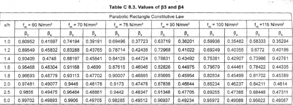 请帮我计算B3和B4的值在表8.3 c - IRC SP 105页没有41“抛物线-矩形应力块”“外中性轴节”我想用方程而不是使用插值表