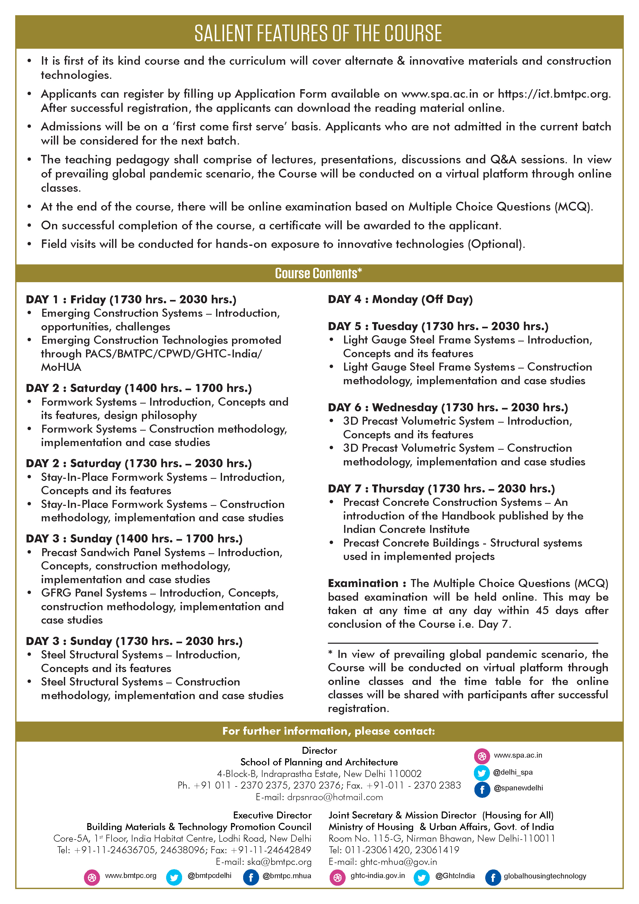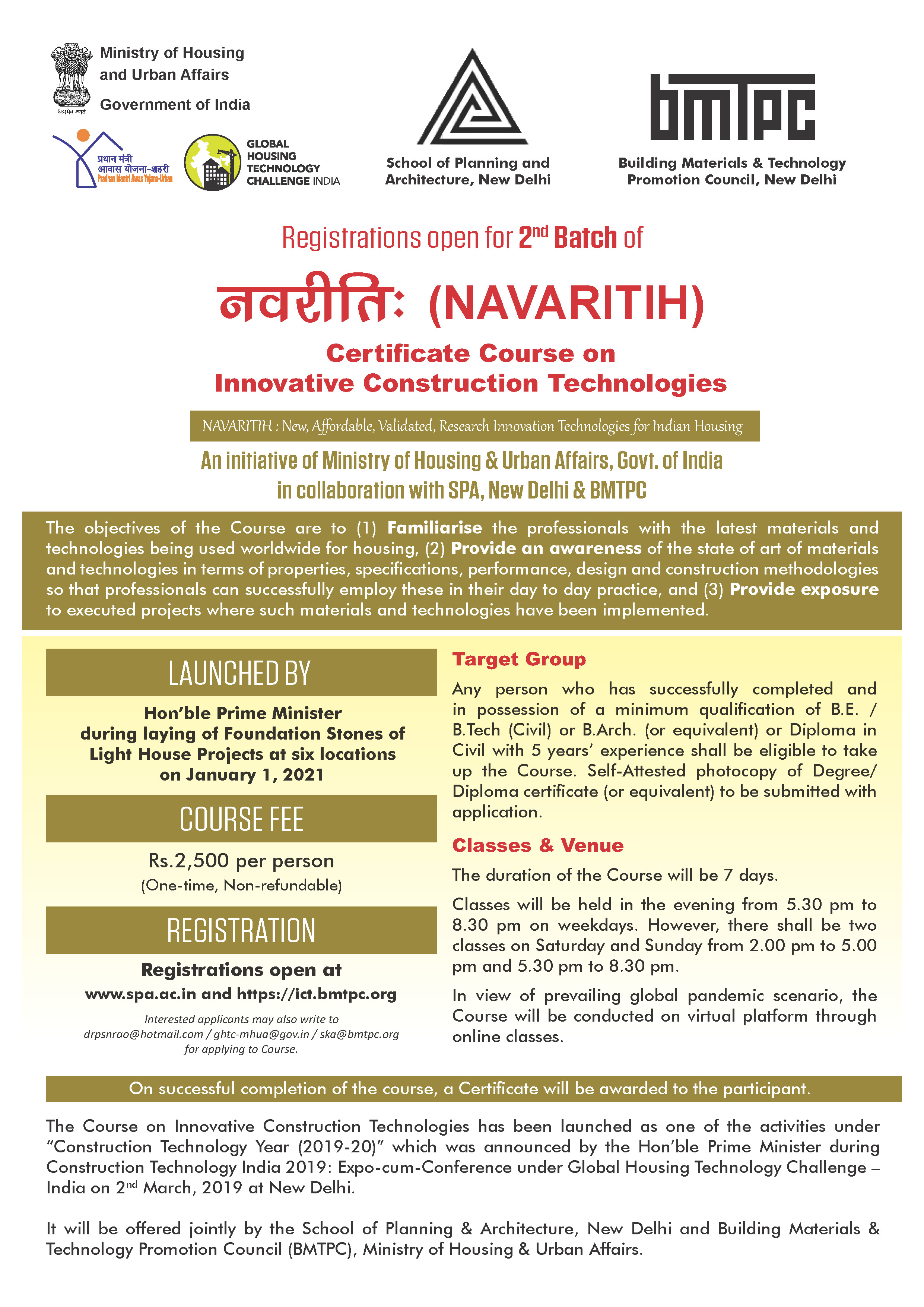 为了构建能力和东方有关的利益相关方学习和适应这些创新施工技术,所有有关官员/教师,学生的工程、建筑和规划、研究学者和科学家们要求注册课程,帮助国家建筑业的技术过渡。在课程的链接注册https://ict.bmtpc.org�。随信附上第二课的传单NAVARITIH作为参考,最后电子邮件。��